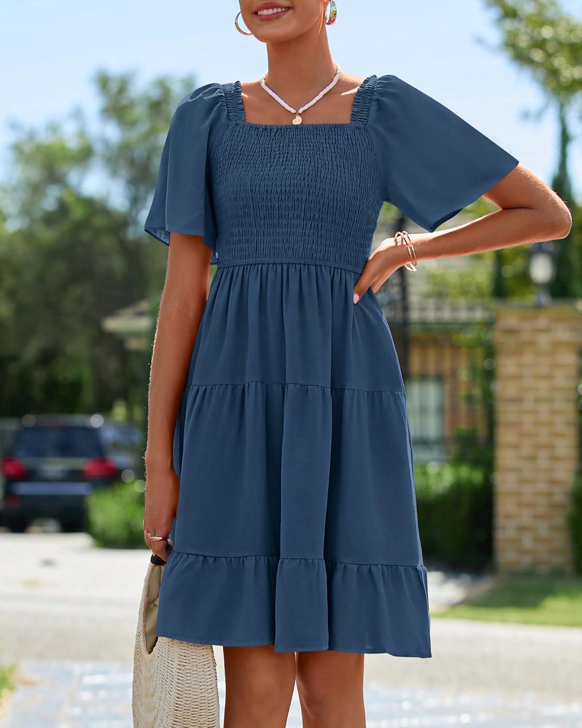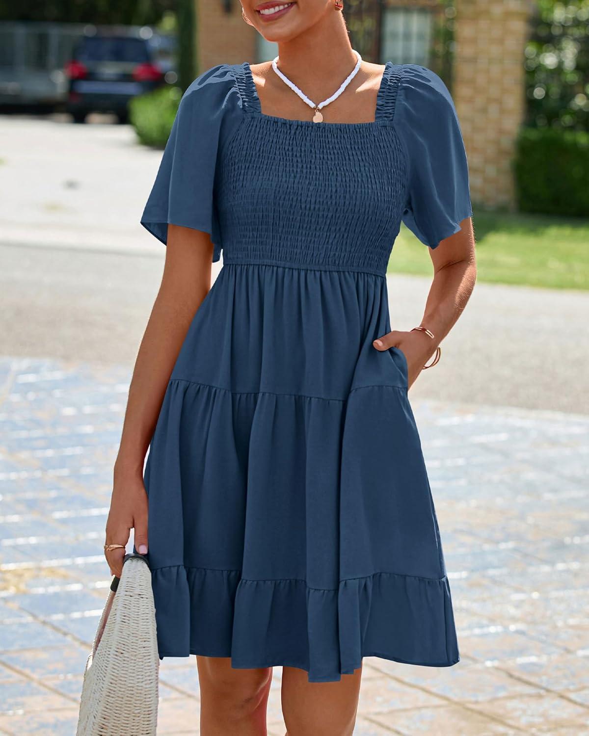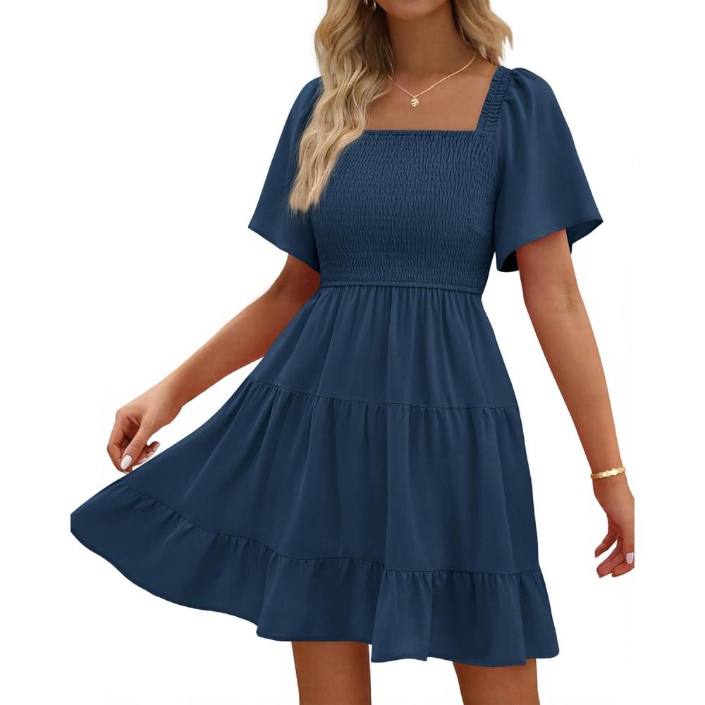 BTFBM Womens Summer Smocked Mini Dress Spring Square Neck Flutter Sleeve Casual Ruffle Swing Boho Beach Dresses Pockets(Dark Blue)