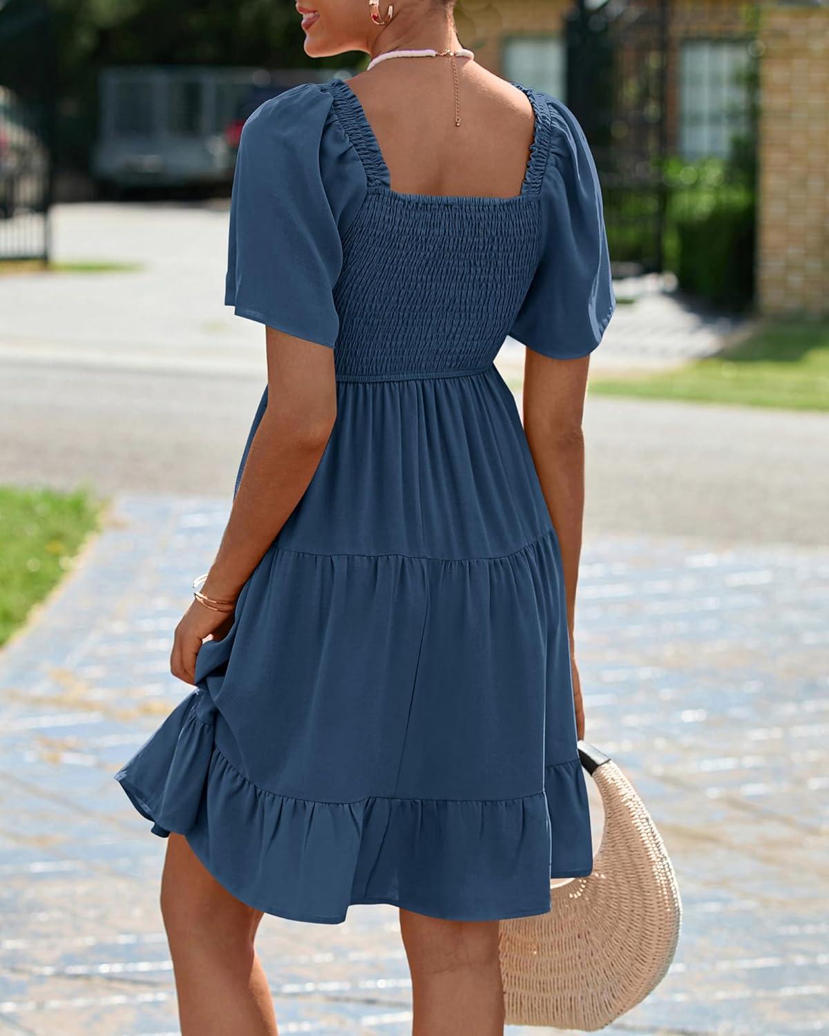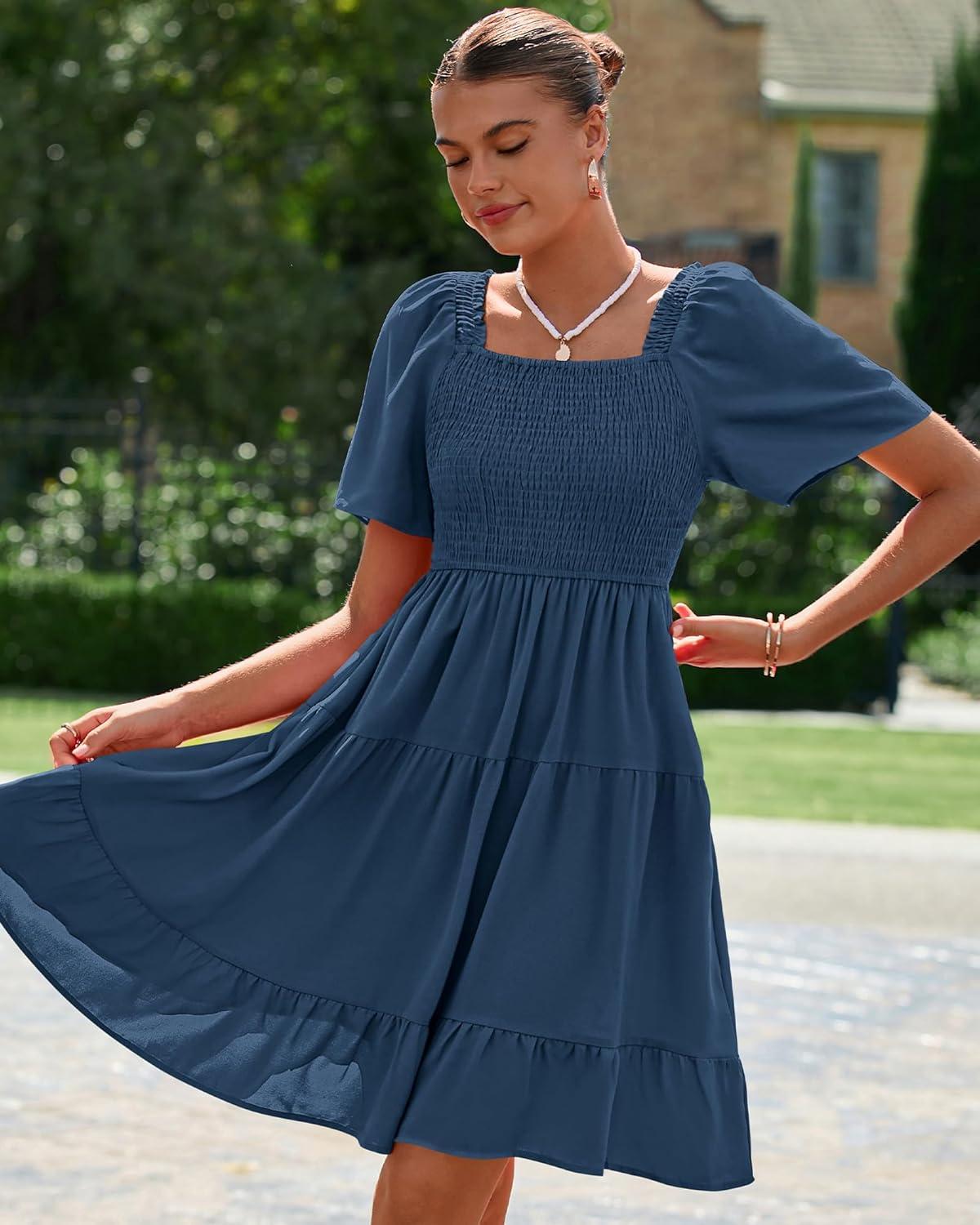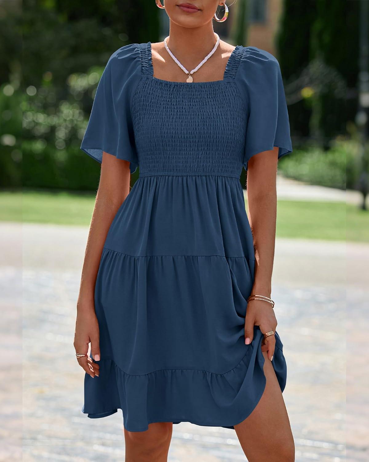 BTFBM Womens Summer Smocked Mini Dress Spring Square Neck Flutter Sleeve Casual Ruffle Swing Boho Beach Dresses Pockets(Dark Blue)