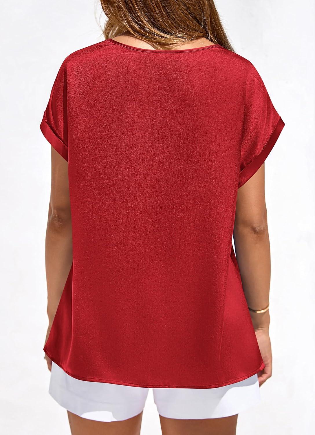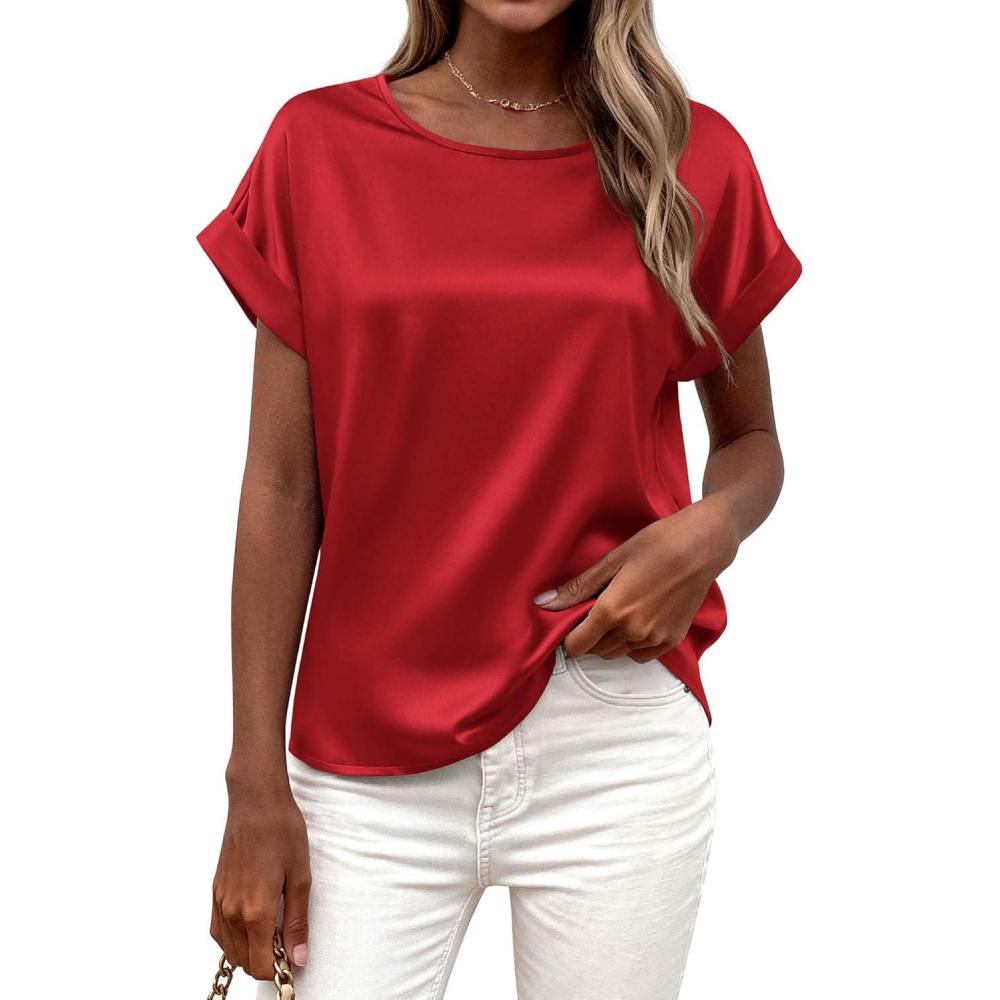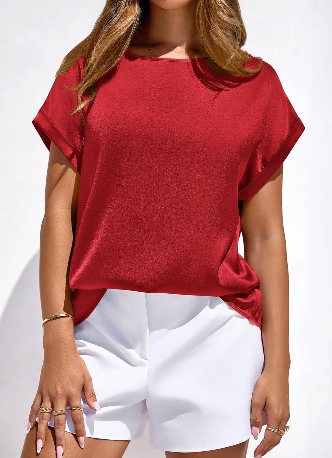 BTFBM Womens Summer Tops 2026 Satin Crewneck Short Sleeve Shirts Work Business Outfits Spring Blouses Dressy Casual(Red)