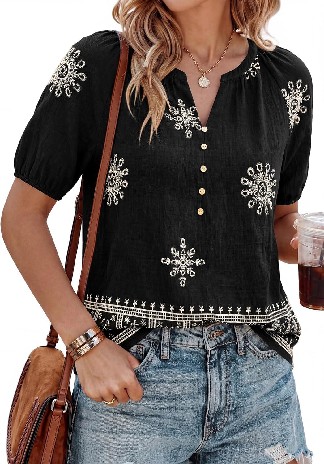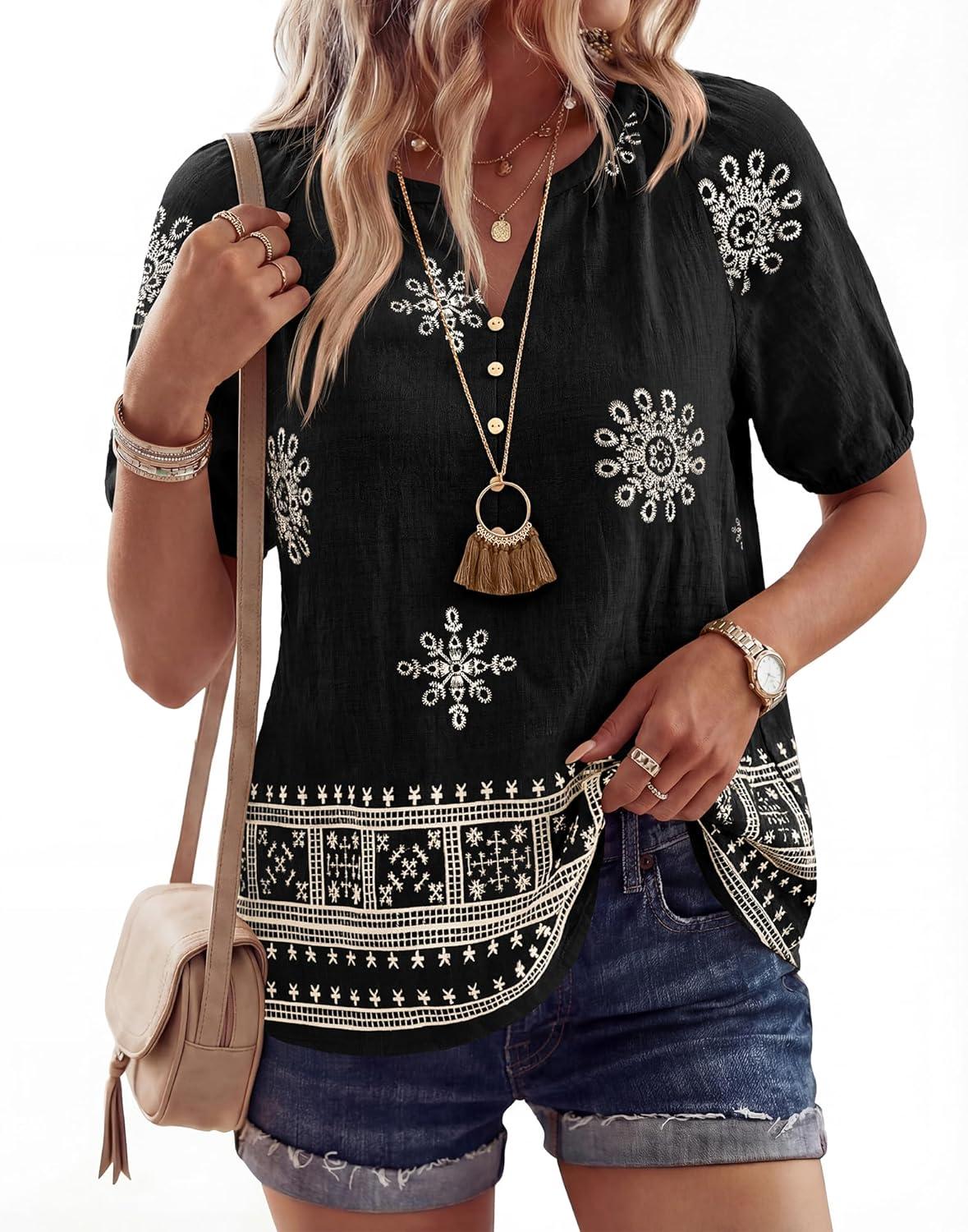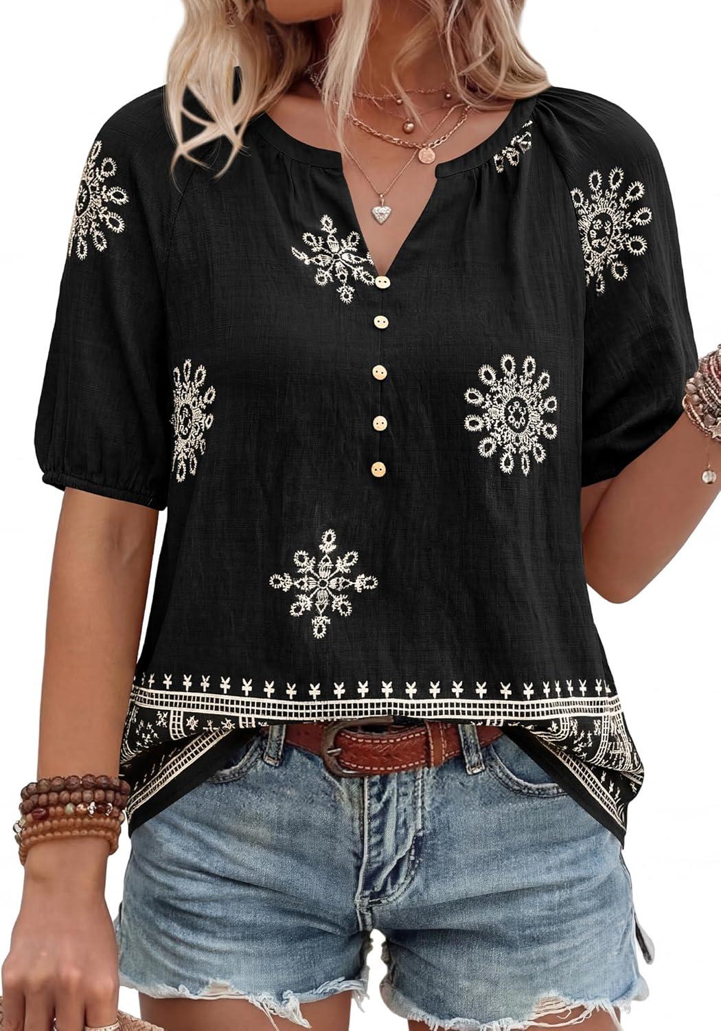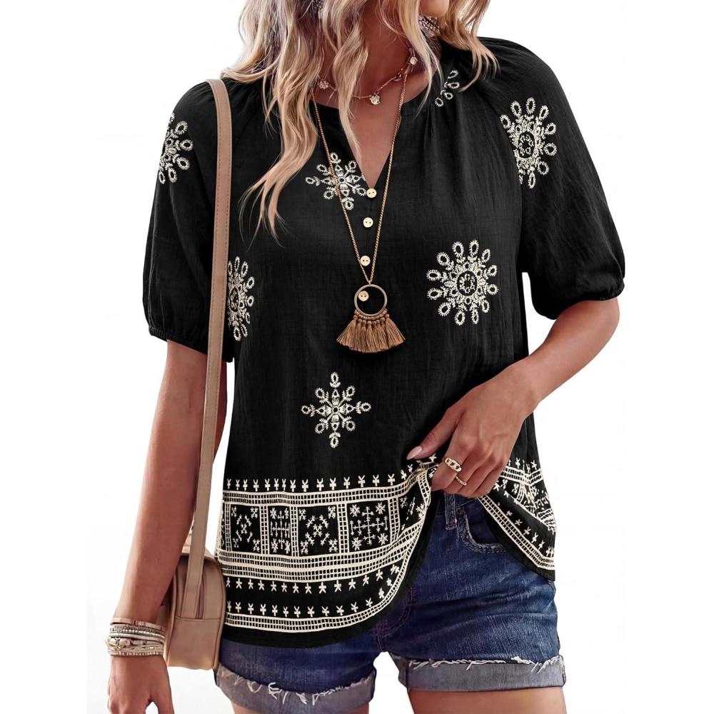 BTFBM Womens Summer Tops Boho V Neck Short Sleeve Dressy Casual Business Blouses Flowy Floral Print Shirt Trendy 2026(Floral Black Apricot)