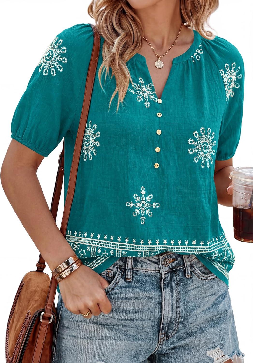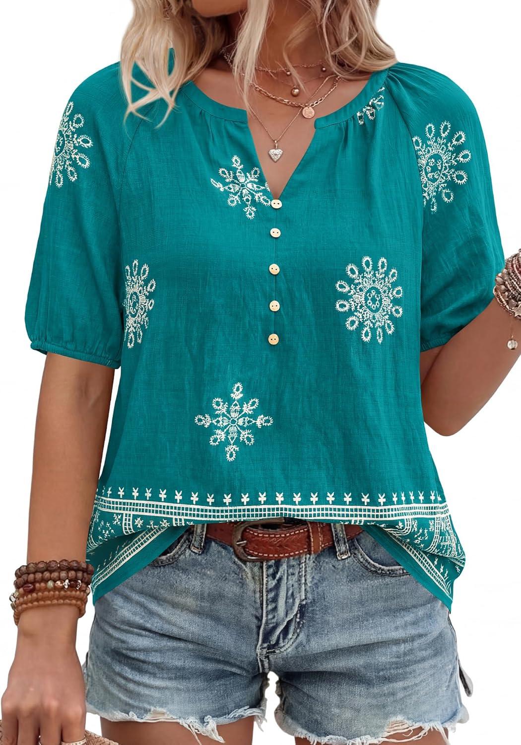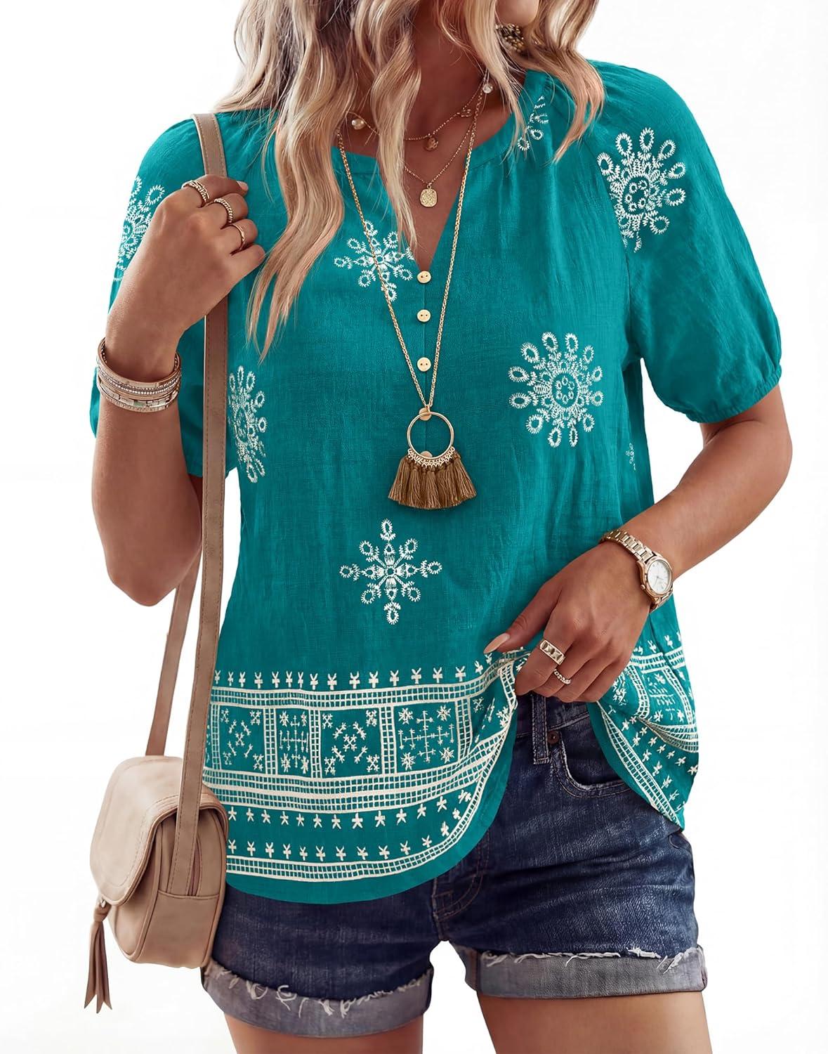 imageBTFBM Womens Summer Tops Boho V Neck Short Sleeve Dressy Casual Business Blouses Flowy Floral Print Shirt Trendy 2026Floral Lake Blue White