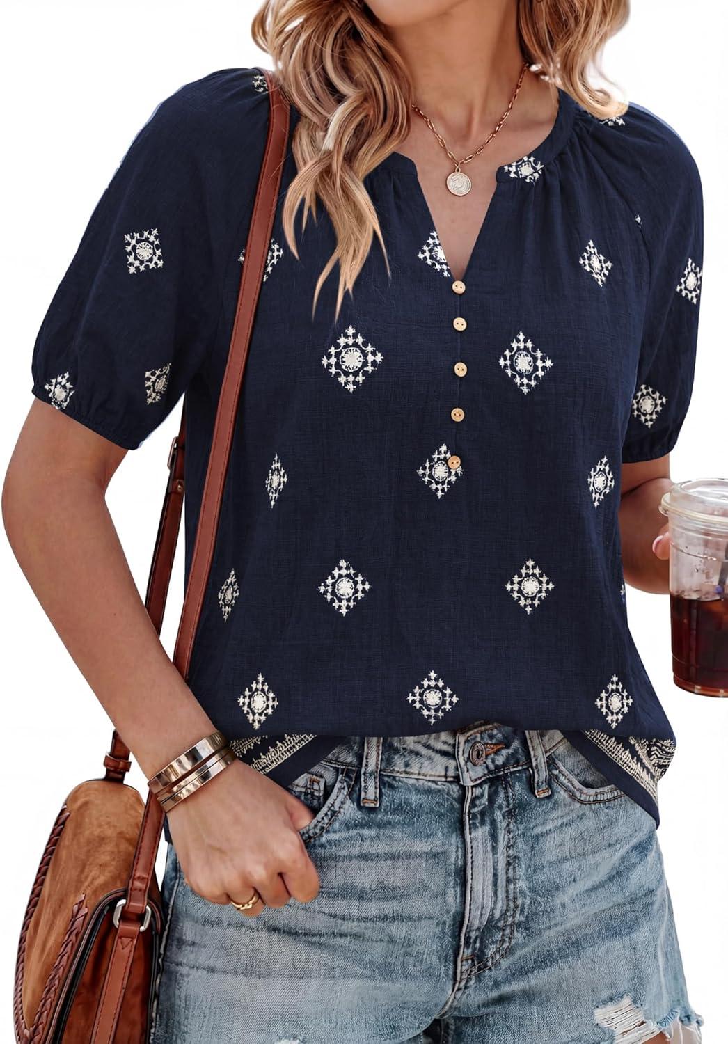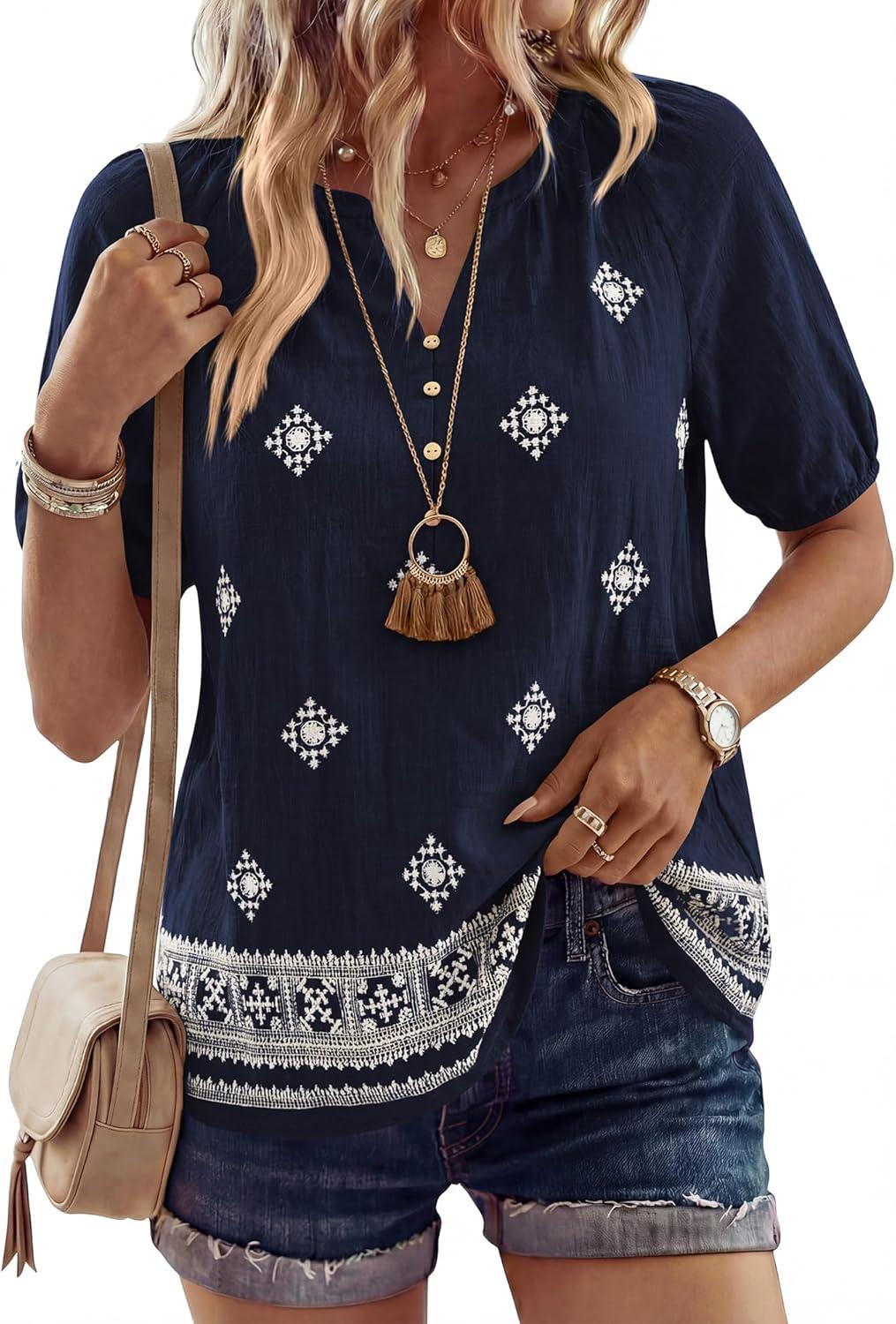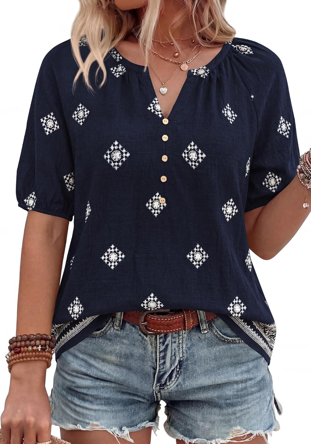 BTFBM Womens Summer Tops Boho V Neck Short Sleeve Dressy Casual Business Blouses Flowy Floral Print Shirt Trendy 2026(Floral White Navy)