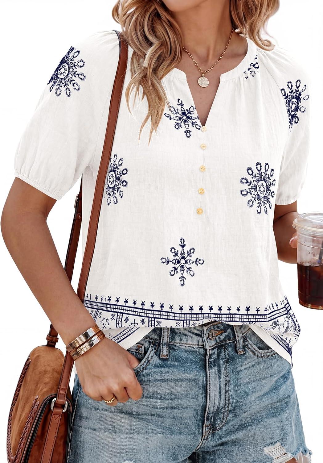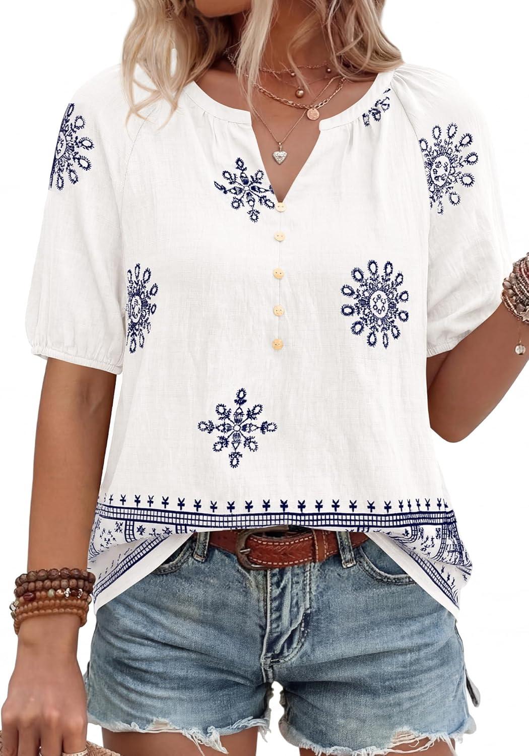 BTFBM Womens Summer Tops Boho V Neck Short Sleeve Dressy Casual Business Blouses Flowy Floral Print Shirt Trendy 2026(Floral White Navy)
