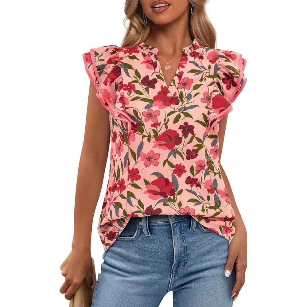 BTFBM Womens Tops Dressy Casual 2026 Spring Summer Shirts Boho Floral V Neck Ruffle Cap Sleeve Business Work Blouses(Floral Orange Pink Red)