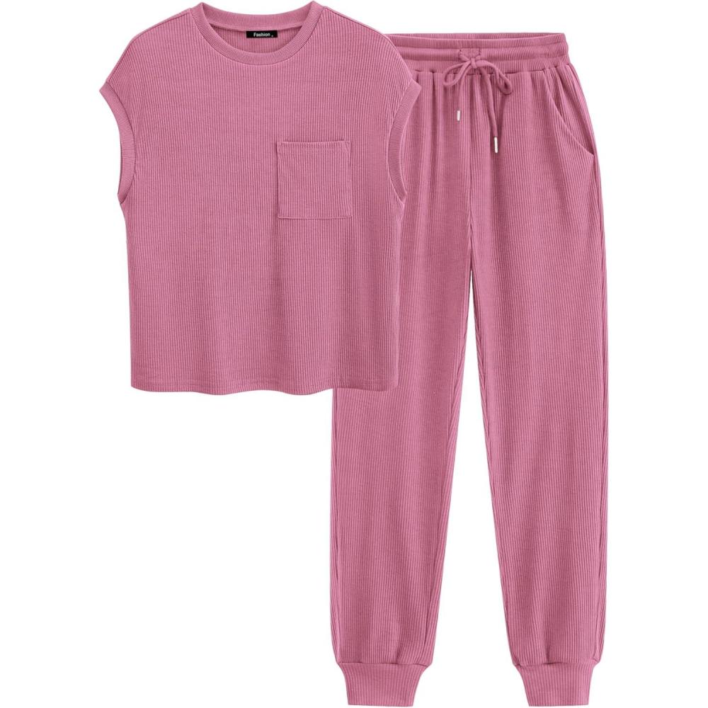 BTFBM Women’s Two Piece Tracksuit Outfits Summer Short Sleeve Tops Long Pants Jogger Lounge Matching Sets Sweatsuit(Dark Pink)