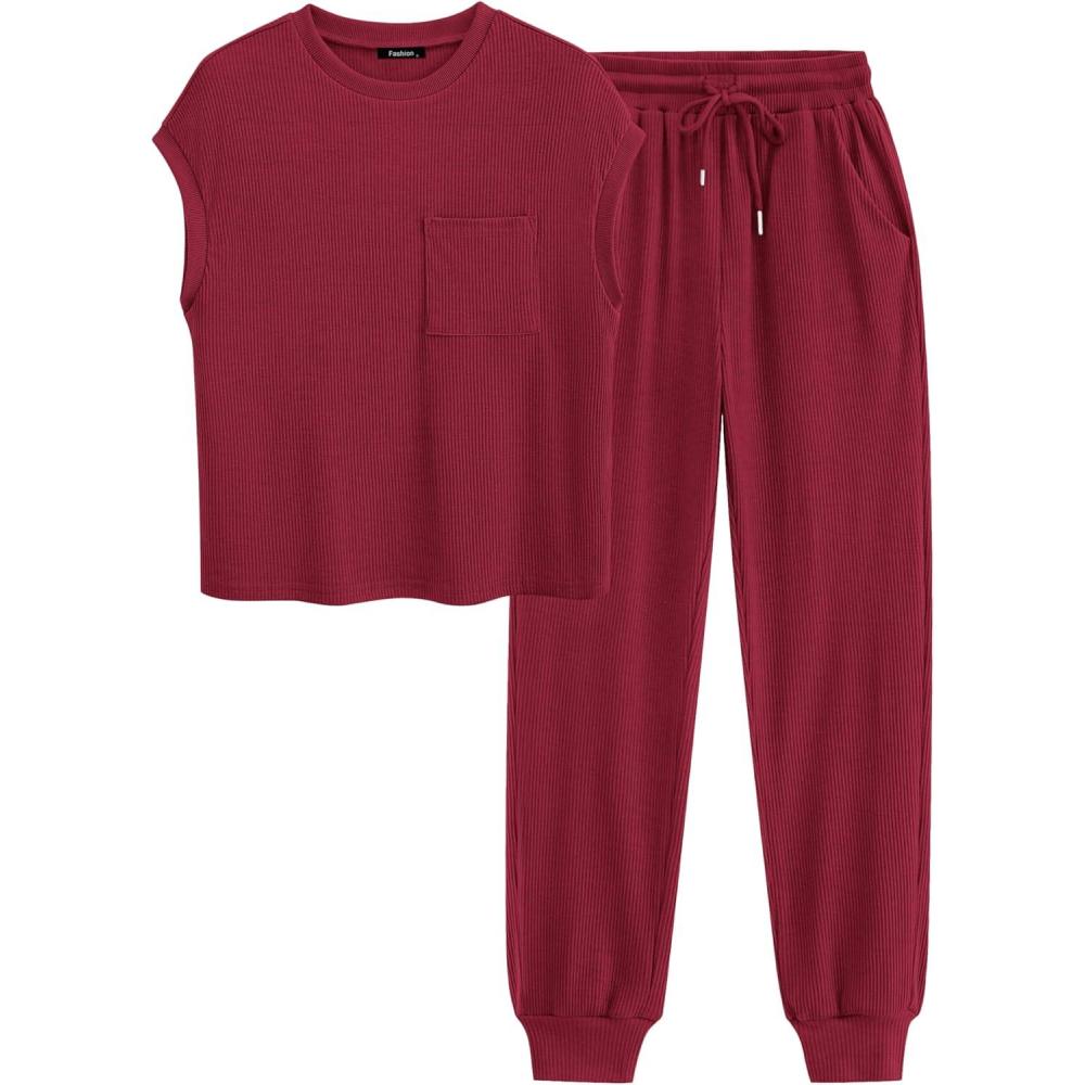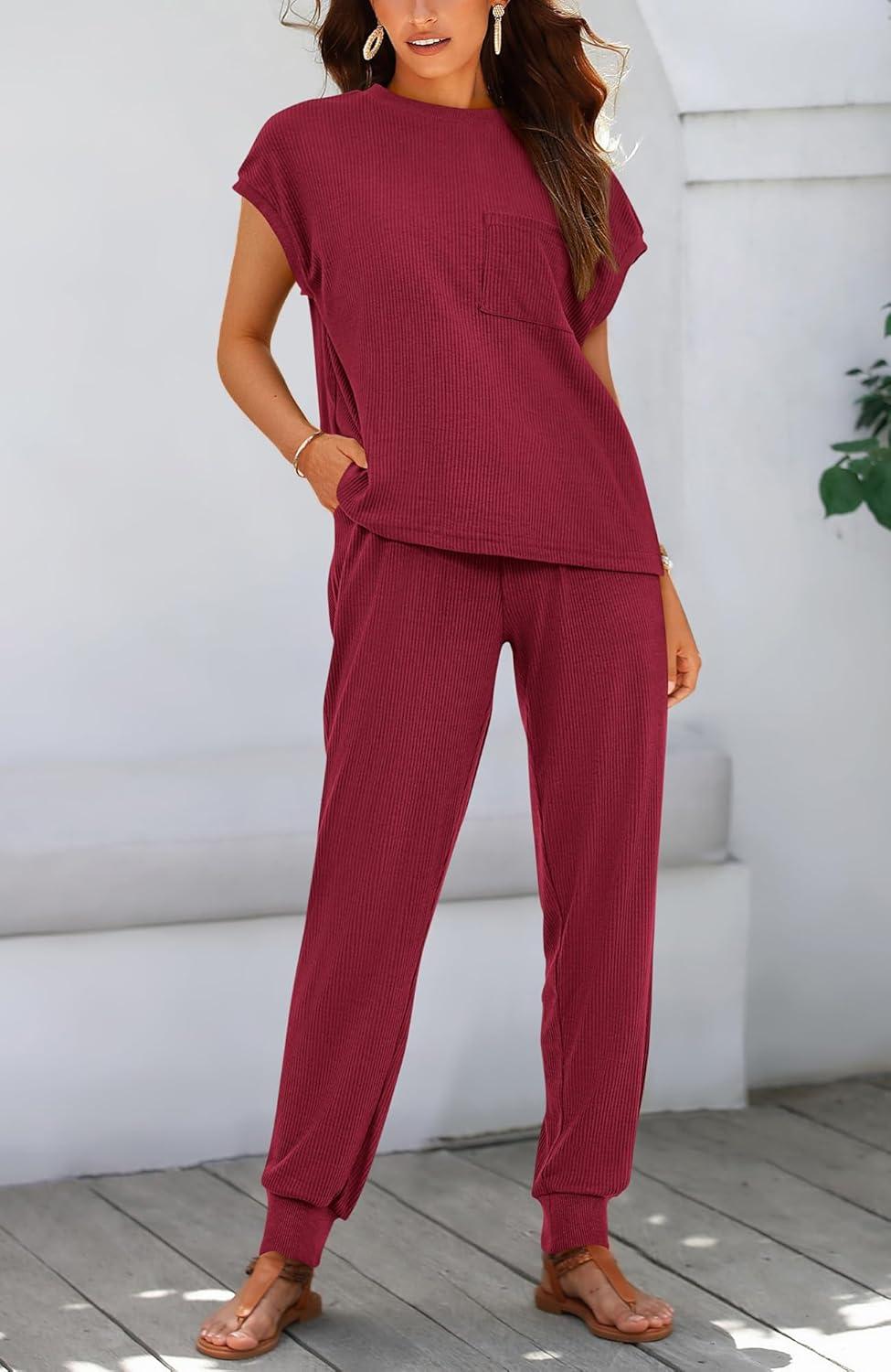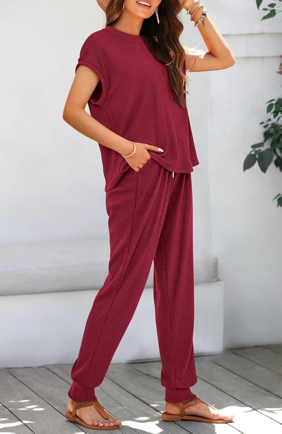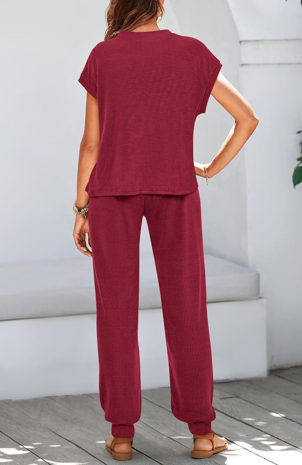 imageBTFBM Womens Two Piece Tracksuit Outfits Summer Short Sleeve Tops Long Pants Jogger Lounge Matching Sets SweatsuitWine Red